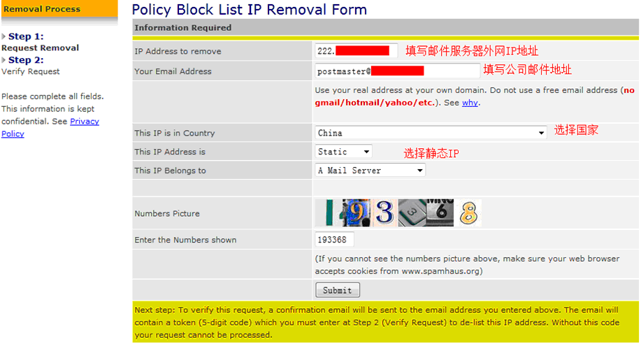 6.最后单击“submit”按钮,提交信息,等待一段时候后spamhaus.org会发封邮件给刚刚提交的邮箱地址。