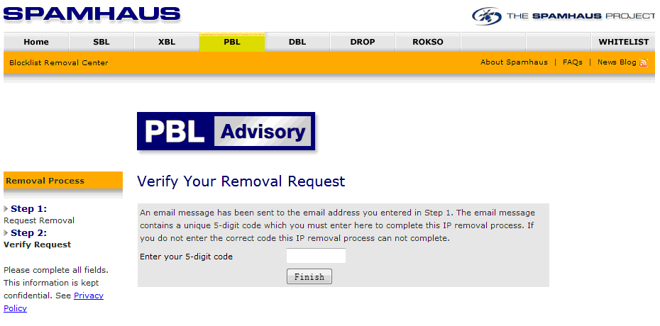 7. 此时,将下方图片中的五位数号码填入 Spamhaus 的网页中。点击finish。